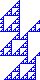 Hierbei ist auch leicht die periodische Randbedingung erkennbar: was links den Rahmen des Bildes verlässt, kommt auf der rechten Seite wieder rein. Auch auffallend ist die Komplexität, die sich nach gewisser Zeit entwickelt: anfangs ist nur eine einzige Zelle 1, aber nach kurzer Zeit breitet sich die Struktur nach links aus und formiert dabei verschieden große Dreieckstrukturen.